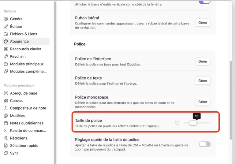 Ctrl + molette de la souris (Windows) ou le geste de pincement sur le trackpad (Mac) — sans passer par les paramètres. En quelques clics, vous avez configuré les réglages essentiels d’Obsidian et choisi une apparence qui vous ressemble. Votre atelier d’auteur numérique est maintenant à votre image.