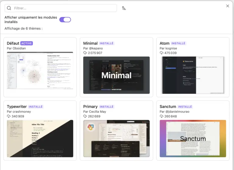 Obsidian propose des centaines de thèmes créés par sa communauté. Voici trois thèmes particulièrement adaptés aux écrivains.