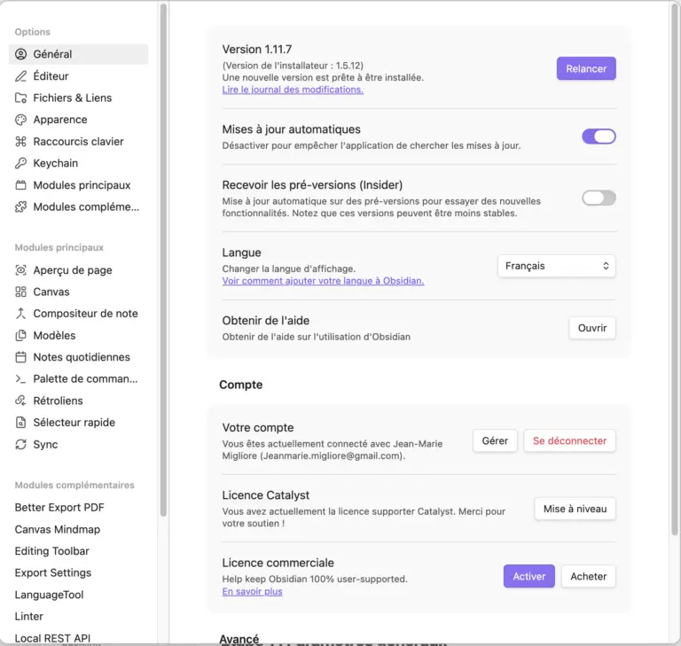 ① Les mises à jour automatiques Cochez “Mises à jour automatiques”. Obsidian vérifiera et installera les nouvelles versions sans que vous ayez à vous en occuper.