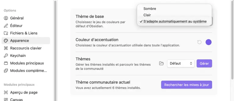 Le thème par défaut d’Obsidian est parfaitement utilisable. Les thèmes communautaires sont un plaisir, pas une nécessité. Si vous hésitez, commencez sans thème et installez-en un plus tard quand vous serez à l’aise avec le logiciel.