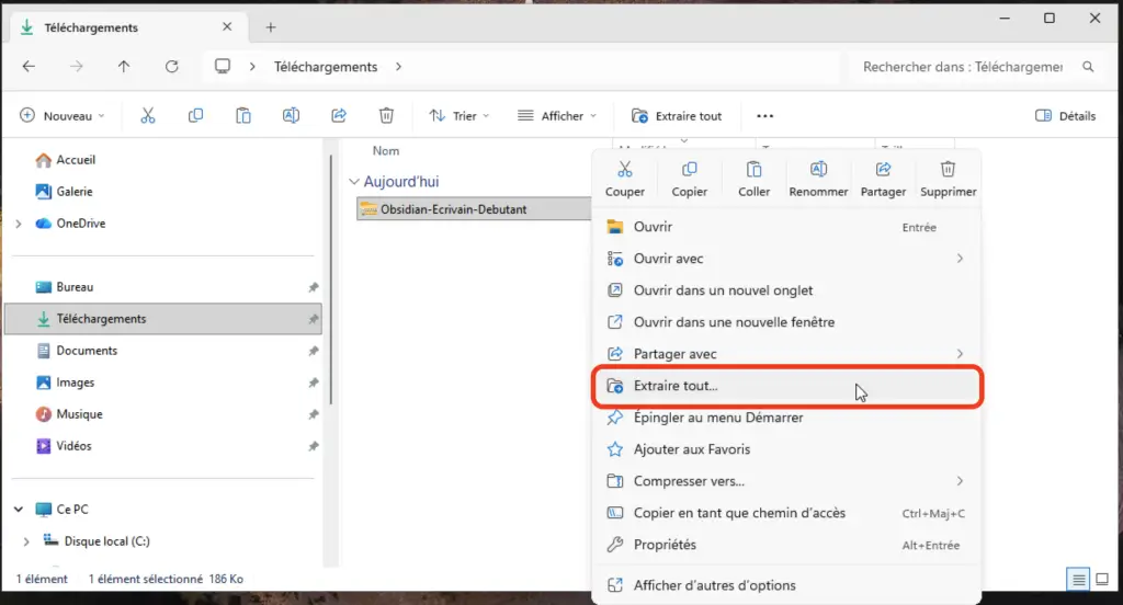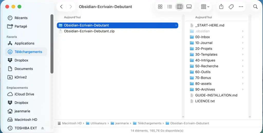 À la fin de cette étape, vous devez voir un dossier nommé Obsidian-Ecrivain-Debutant.zip dans vos Documents.