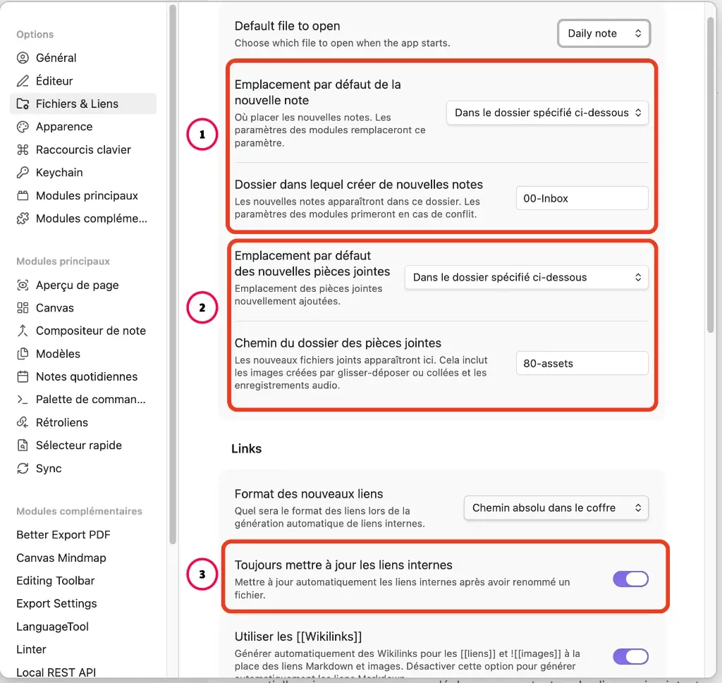 Cochez “Toujours mettre à jour les liens internes”. C’est une option de sécurité essentielle : si vous renommez ou déplacez une note, tous les liens qui pointent vers elle sont mis à jour automatiquement dans tout le vault.