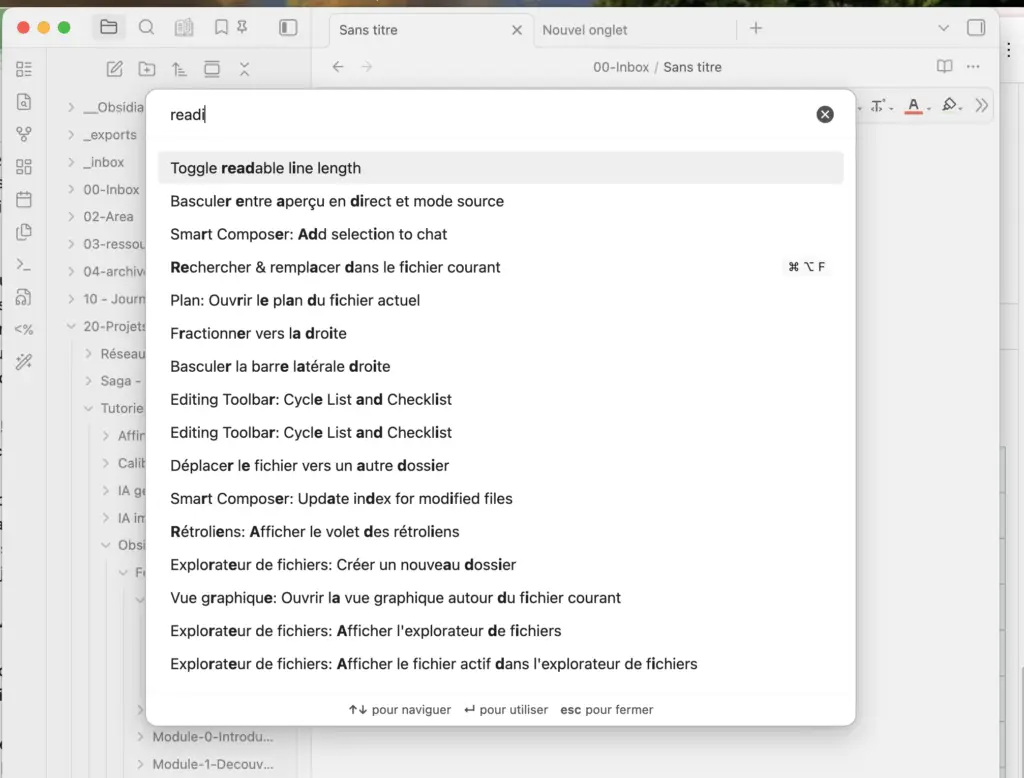 C’est votre filet de sécurité. Si vous ne connaissez pas un raccourci, appuyez sur Cmd/Ctrl + P et tapez ce que vous voulez faire en français — Obsidian trouve la commande pour vous. Par exemple, tapez “lire” pour basculer en mode lecture.