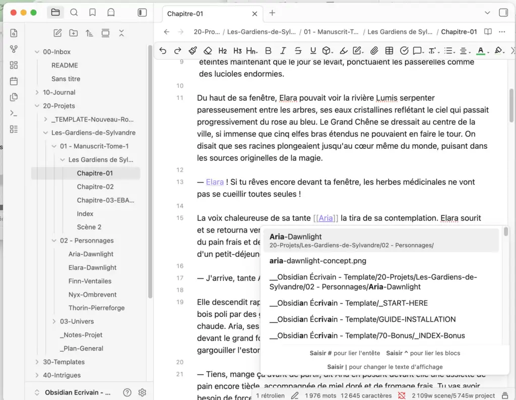 [[ dans n’importe quelle note, puis commencez à écrire le nom d’un personnage ou d’un lieu — Obsidian vous propose la fiche correspondante. C’est ainsi que vous tissez le réseau de votre univers littéraire.