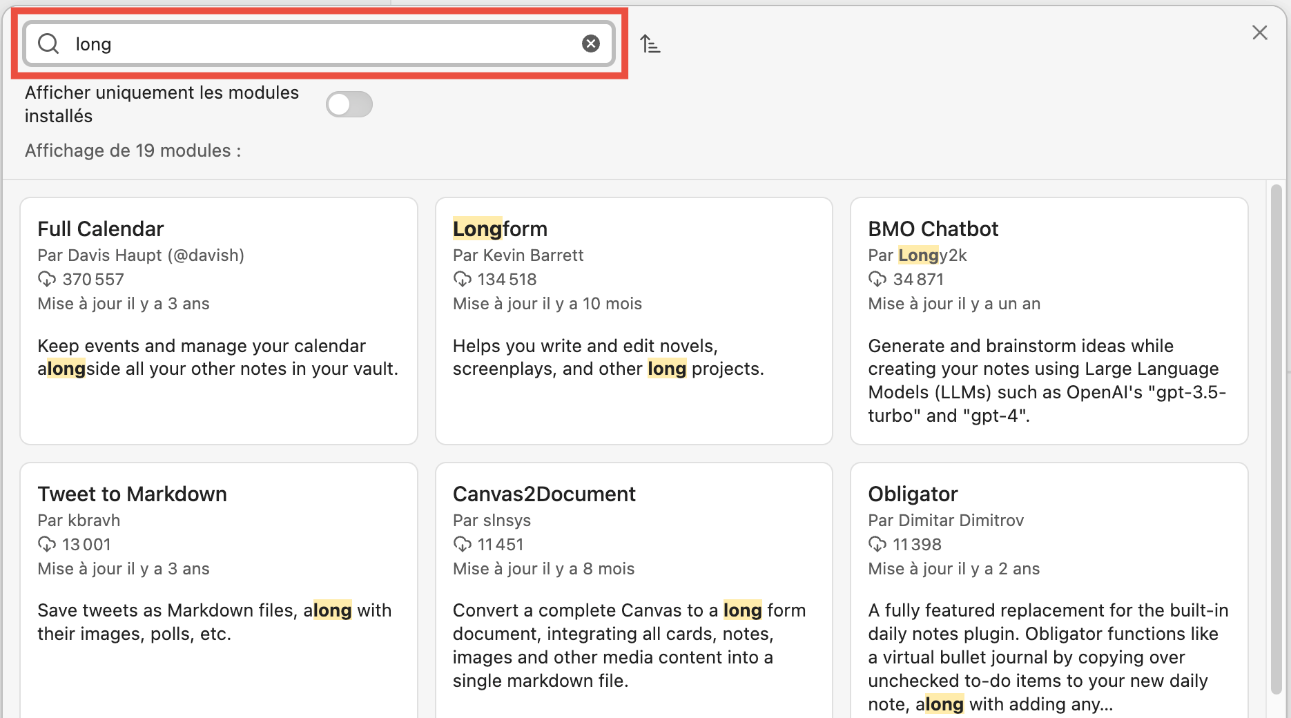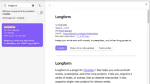 Les Community Plugins sont des extensions développées par la communauté Obsidian. Longform en fait partie.