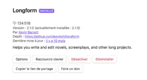 Longform est LE plugin indispensable pour tout écrivain utilisant Obsidian. C’est un outil spécialement conçu pour l’écriture de longs textes : romans, nouvelles, essais, scénarios, etc.