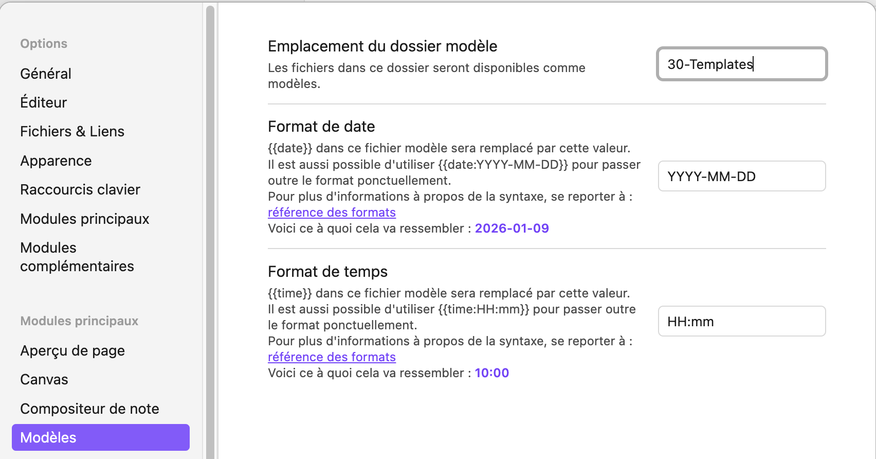 Obsidian créera automatiquement le dossier `30-Templates/` dans votre coffre.
