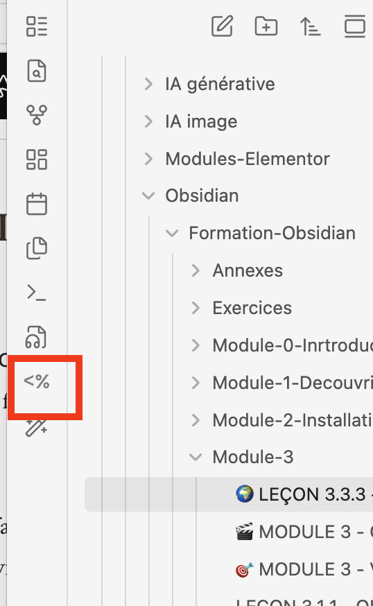 Option A — Via l’icône Templater (la plus rapide) Repérez l’icône <% dans la barre latérale gauche d’Obsidian et cliquez dessus. Un panneau s’ouvre avec la liste de vos templates disponibles.Cliquez sur Template-Fiche-Regle — le contenu s’insère instantanément dans votre note.