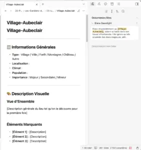 C’est ce qu’on appelle les **liens bidirectionnels**. Concrètement, cela signifie que vous pouvez ouvrir la fiche du village de Cloonnaraigh et voir immédiatement : quels personnages y vivent ou y sont passés, quels chapitres s’y déroulent, quels événements historiques y ont eu lieu.