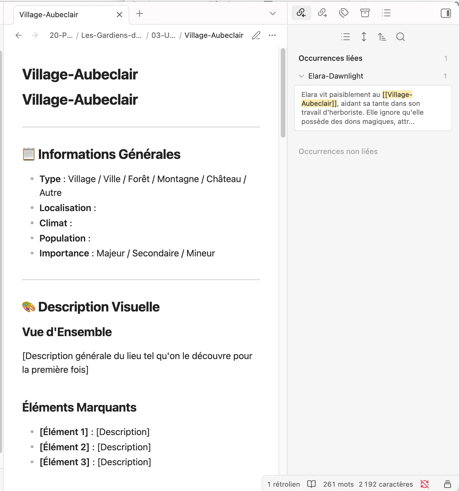 vous écrivez `[[Cloonnaraigh]]` dans la fiche d’un personnage, vous créez automatiquement un lien dans les deux sens. La note du village sait désormais qu’elle est mentionnée dans la fiche de ce personnage. Et vice-versa.