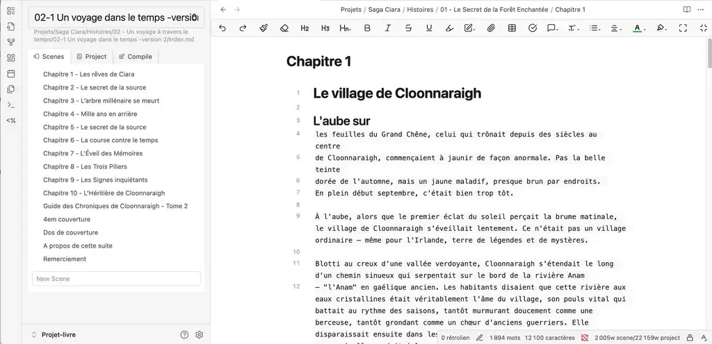 - Dossier de scènes : Un fichier Markdown par chapitre