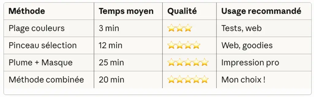 La méthode combinée (Pinceau + Plume) offre le meilleur compromis temps/qualité pour des résultats professionnels.