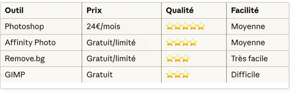- Remove.bg : 0,20€/image (s’accumule vite)